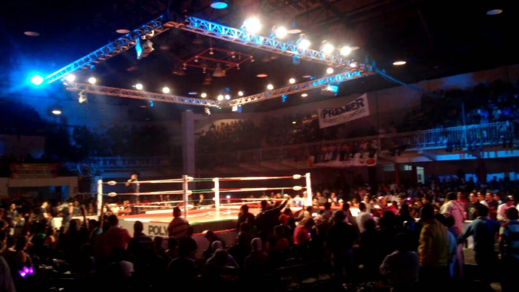 Durante una función de lucha libre, un hombre cayó desde el balcón VIP tras ser empujado mientras el público rodeaba al luchador Mr. Iguana.