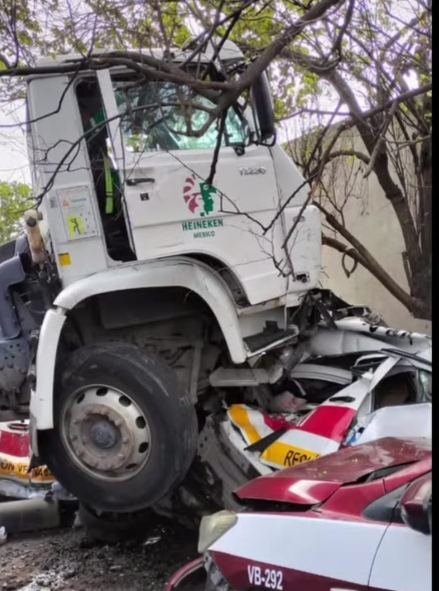 En el accidente un chofer de taxi quedo prensado dentro de su unidad luego de ser impactado por un camión de carga.
