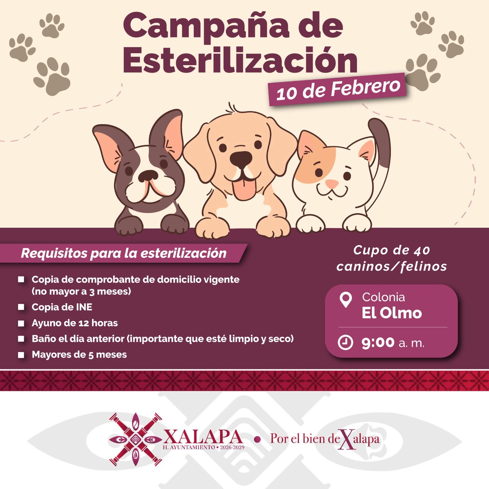 El H. Ayuntamiento de Xalapa invita a la campaña de esterilización, la cual se realizará el próximo 10 de febrero en la colonia El Olmo en esta ciudad capital.