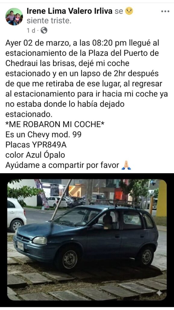 “El pasado 02 de marzo a las 8:20 pm llegué al estacionamiento de la plaza del puerto de Chedraui Las Brisas y dejé mi coche estacionado. Aproximadamente dos horas después, cuando regresé para retirarme del lugar, mi vehículo ya no estaba donde lo había dejado”, expresó la víctima Irene Lima Valero Irliva.