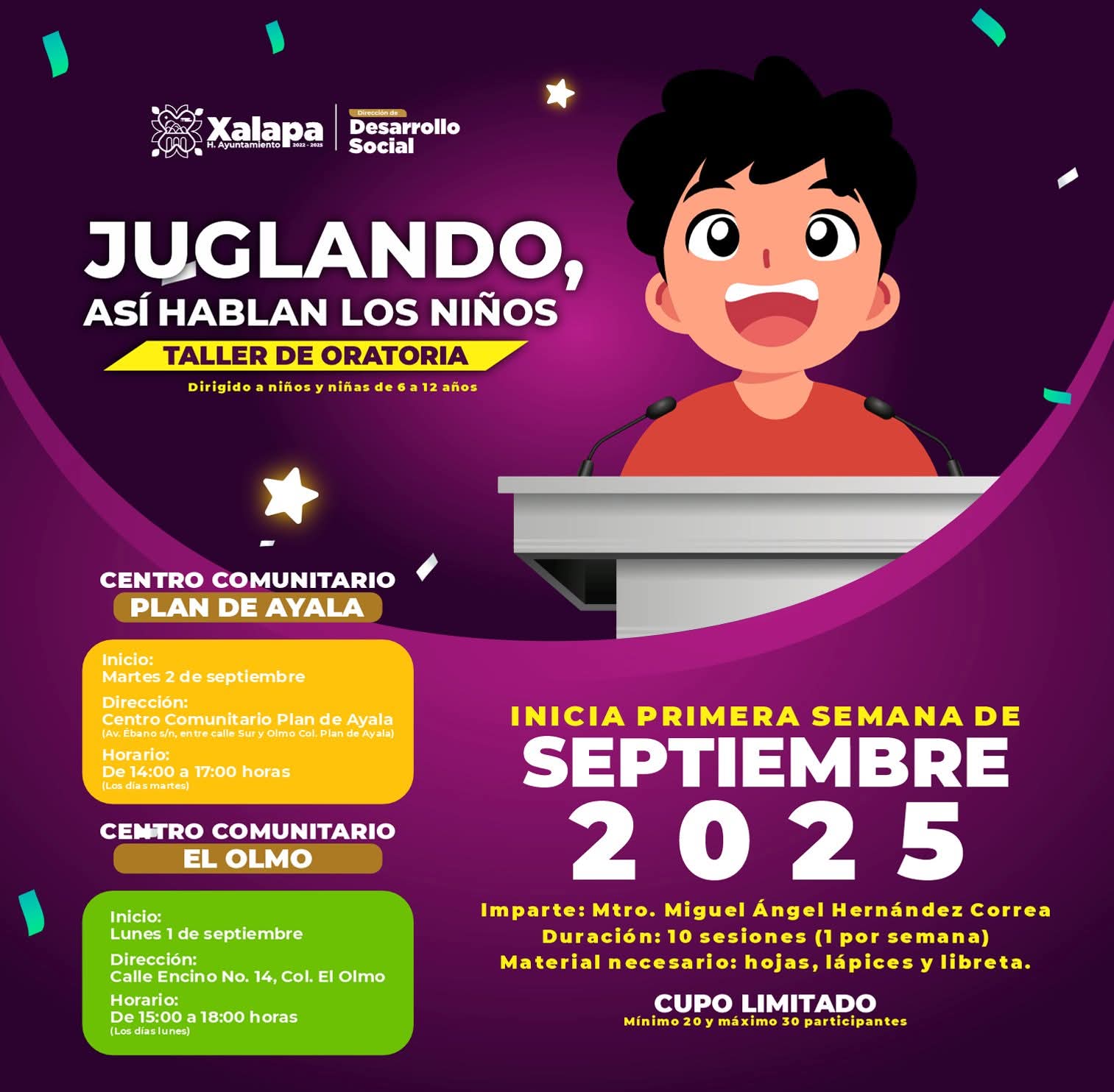 La Dirección de Desarrollo Social invita a niñas y niños a participar en el “Taller de Oratoria”, el cual se llevará a cabo en los centros comunitarios de Plan de Ayala y El Olmo, daño inicio la primera semana del mes de septiembre.