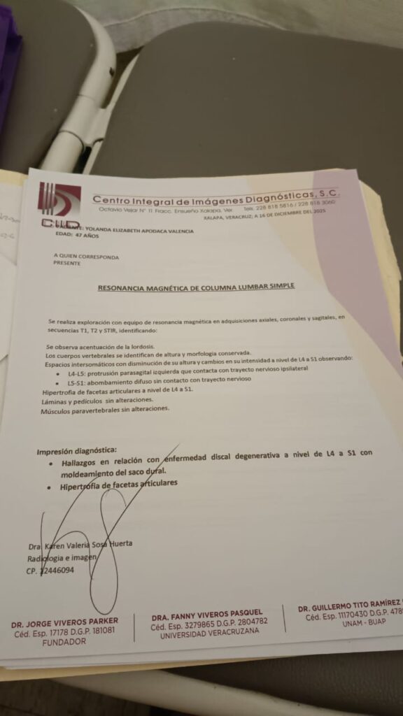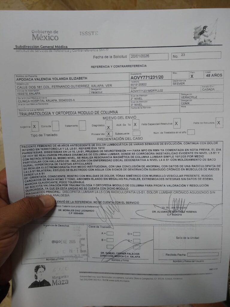 Finalmente, añadió que únicamente le han dado medicamento oral y que los doctores del ISSSTE Xalapa, le dicen que se vaya de alta con todo y dolores, y que regrese en abril para su consulta.