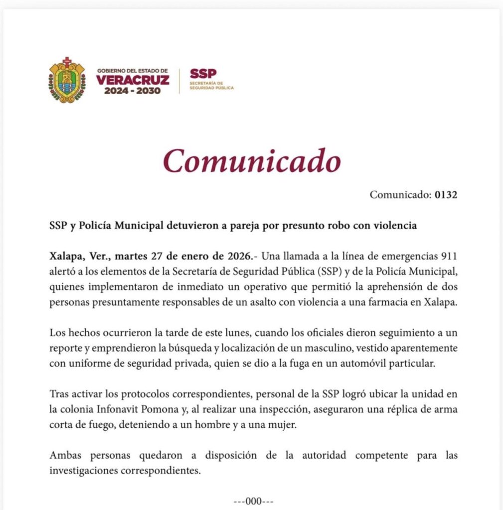 Xalapa, Ver. – Luego de los hechos ocurridos el día de ayer lunes 26 de enero, donde dos personas fueron detenidas tras asaltar una farmacia con violencia, la Secretaría de Seguridad Pública (SSP) del estado de Veracruz informó oficialmente la detención.