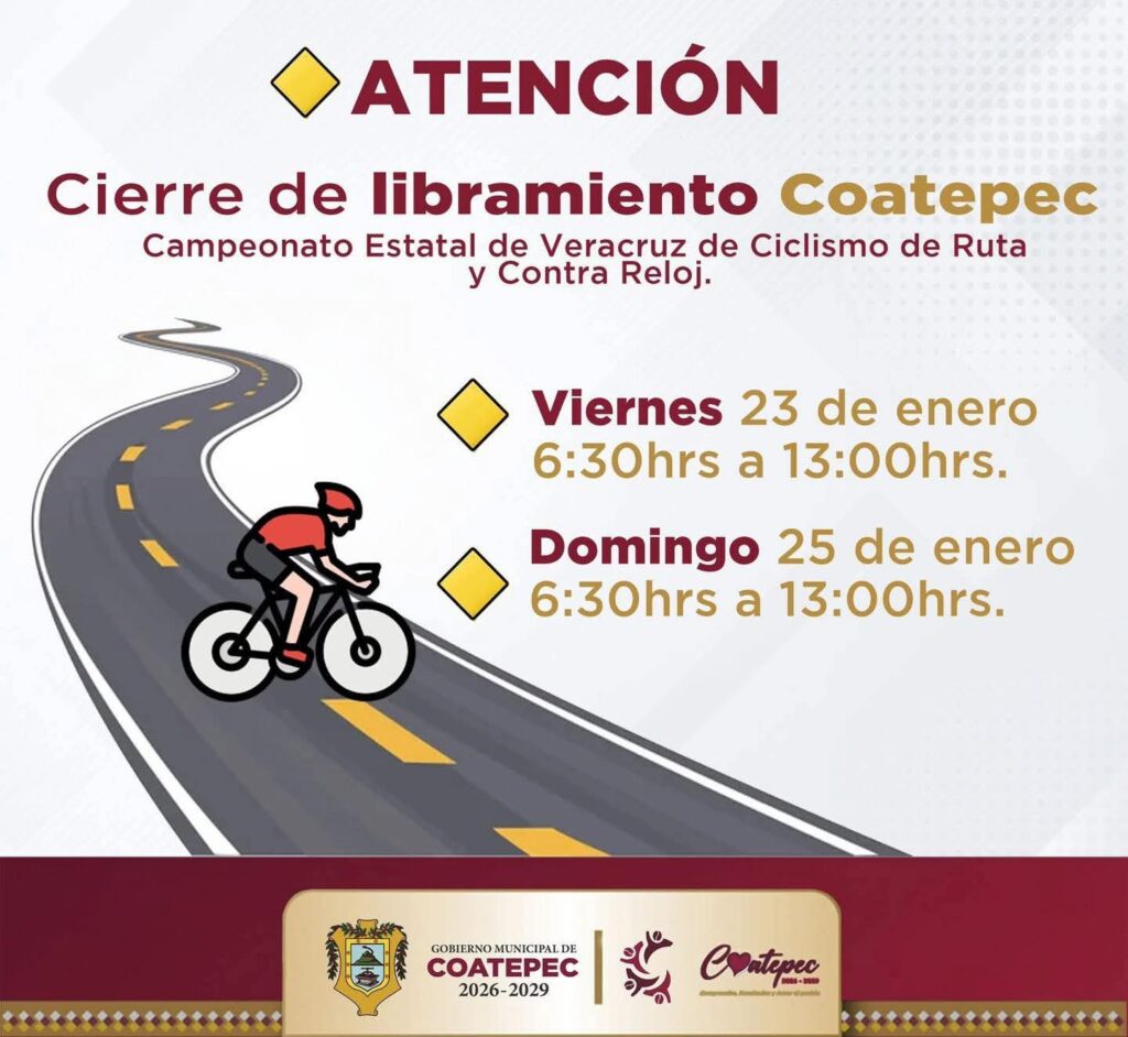Autoridades municipales informaron que el libramiento de Coatepec permanecerá cerrado a la circulación vehicular este próximo viernes 23 y domingo